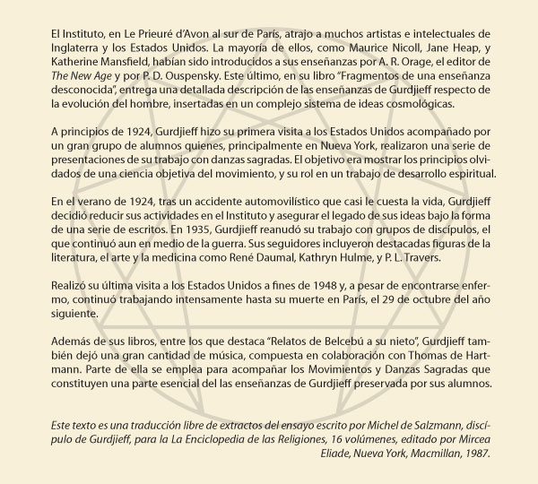“En el trabajo de Gurdjieff aprendemos a Ver realmente quiénes somos. A liberarnos de la prisión de una imagen de nosotros mismos, para llegar a ser auténticamente humanos. Conocemos otras energías dentro y fuera de nosotros, con las que podemos alimentarnos y hacer plena nuestra existencia”.
