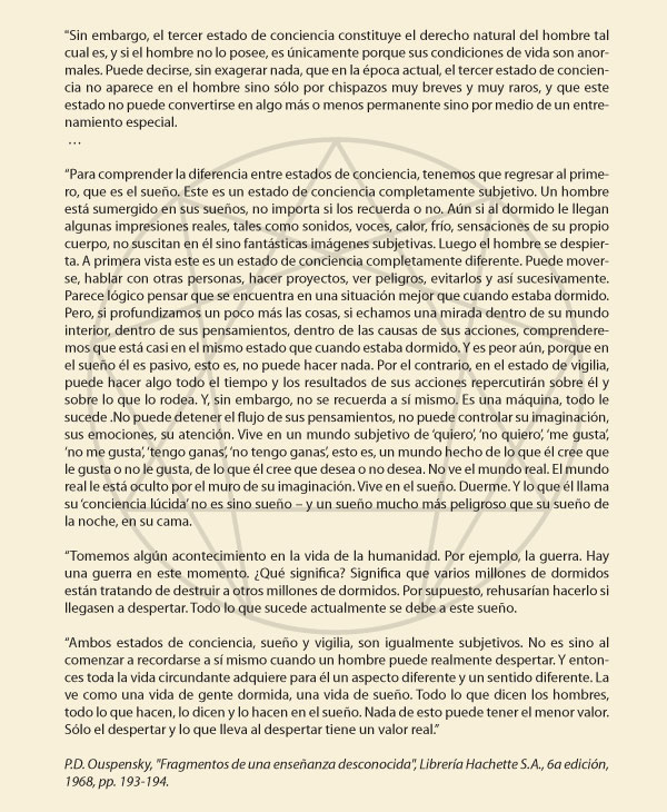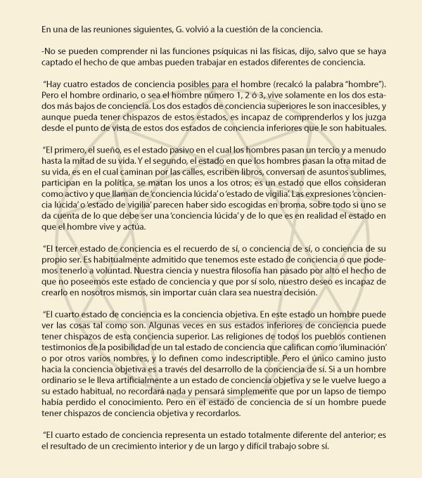 “Hay cuatro estados de conciencia posibles para el hombre (...). Pero el hombre ordinario (...), vive solamente en los dos estados más bajos de conciencia. Los dos estados de conciencia superiores le son inaccesibles, y aunque pueda tener chispazos de estos estados, es incapaz de comprenderlos y los juzga desde el punto de vista de estos dos estados de conciencia inferiores que le son habituales”.